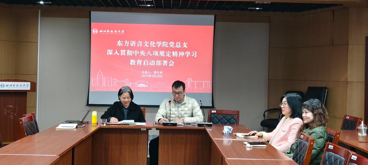 为深入贯彻落实中央八项规定及其实施细则精神,持之以恒纠治 “四风”,切实加强学院作风建设,2025年3月28日,东方语言文化学院组织全体教职工开展专题学习会,集中学习中央八项规定精神相关内容。学院领导班子成员、全体教职工参加会议,会议由学院党支部书记廖礼彬主持。