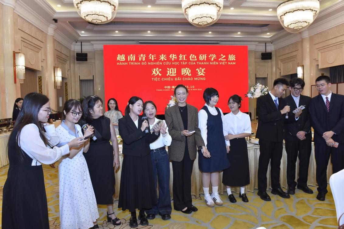 10月12日晚,越南青年来华“红色研学之旅”重庆行活动欢迎晚宴在重庆市人民政府外事办公室大楼举行。欢迎活动由重庆市人民政府外事办公室副主任李明全主持,中国人民对外友好协会会长杨万明、中国外交部亚洲司参赞吴骏、重庆市人大常委会副主任赵世庆等中方代表,以及越南友好组织联合会主席潘英山、越南驻中国大使范清平、越南驻重庆总领事裴元龙、越南青年代表团等越方代表共同出席。我校东方语言文化学院院长罗文青、越南语专业本科教研室主任钟雪映、以及越南语专业10位师生代表应邀参加了欢迎晚宴。晚宴期间,我校师生代表与越南青年代表积极互动,以《友谊天长地久》、《月亮代表我的心》等经典歌曲交流深厚情感、畅叙中越之间的青春友谊。